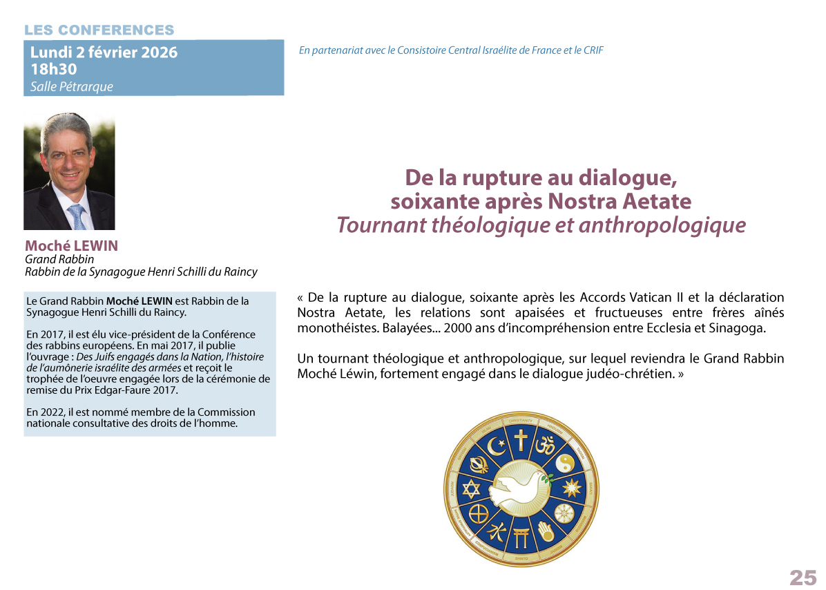 « De la rupture au dialogue, soixante après les Accords Vatican II et la déclaration Nostra Aetate, les relations sont apaisées et fructueuses entre frères aînés monothéistes. Balayés… 2000 ans d’incompréhension entre Ecclesia et Sinagoga. Un tournant théologique et anthropologique, sur lequel reviendra le Grand Rabbin Moché Lewin, fortement engagé dans le dialogue judéo-chrétien. » Le Grand […]